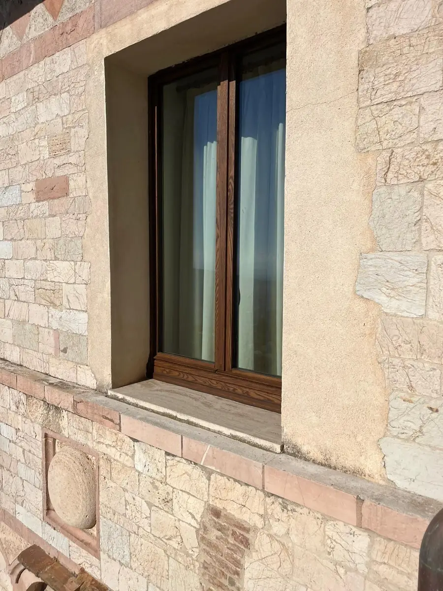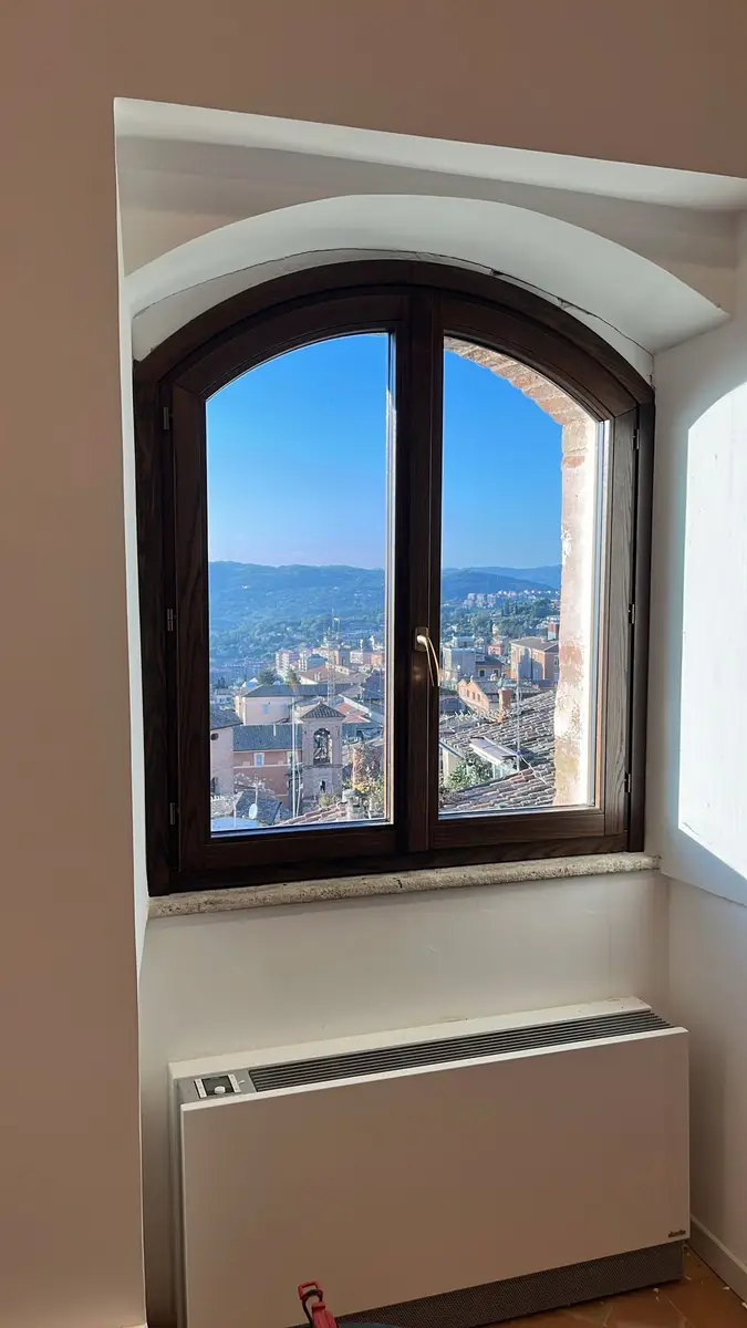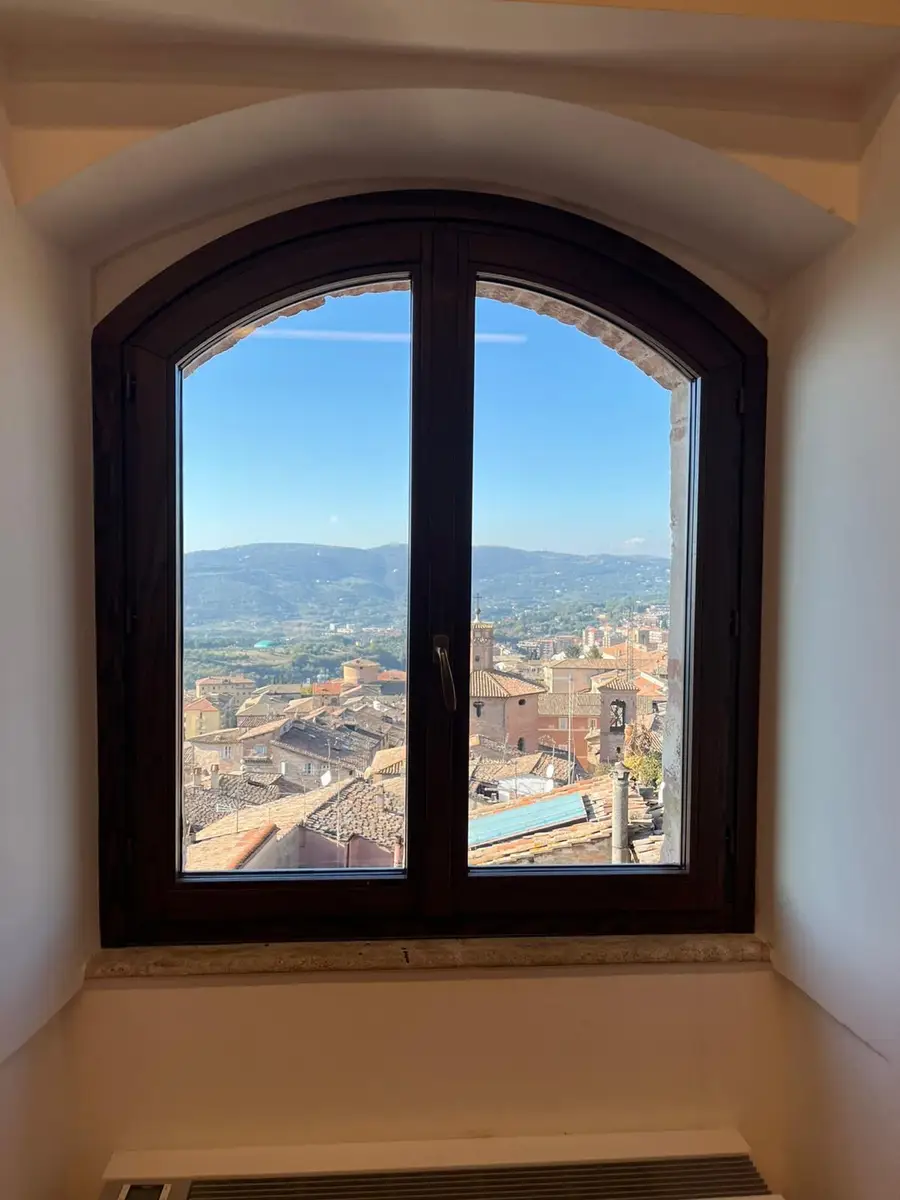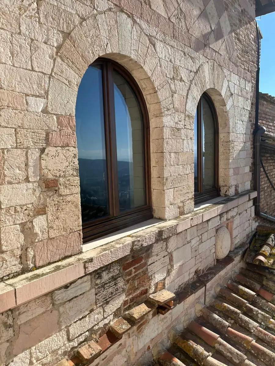 La scelta della finitura degli infissi in legno – Rovere Testa di Moro – assicura un impeccabile equilibrio cromatico e materico, in pieno dialogo con le superfici lapidee e le cromie tipiche dell’architettura medievale umbra senza rinunciare a un’elevata fedeltà estetica al contesto originario.