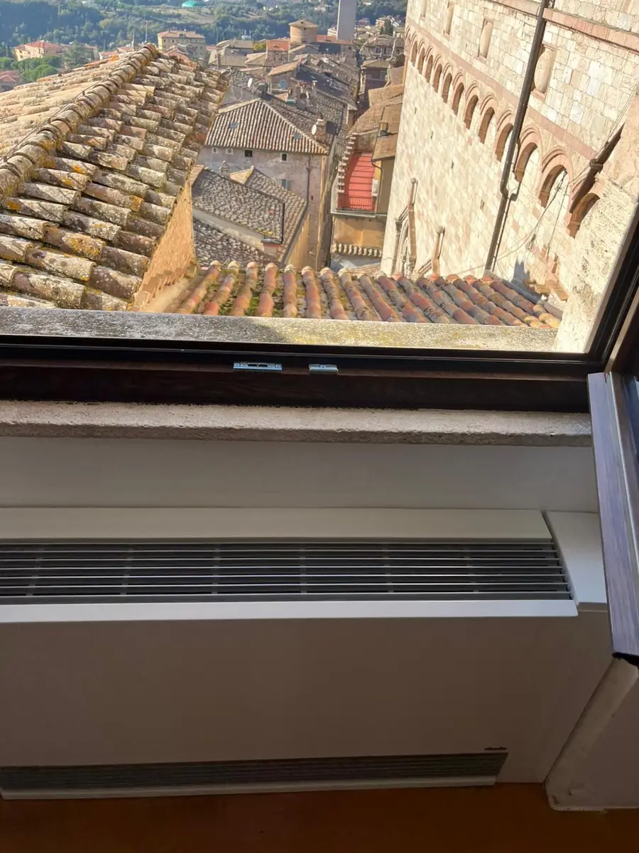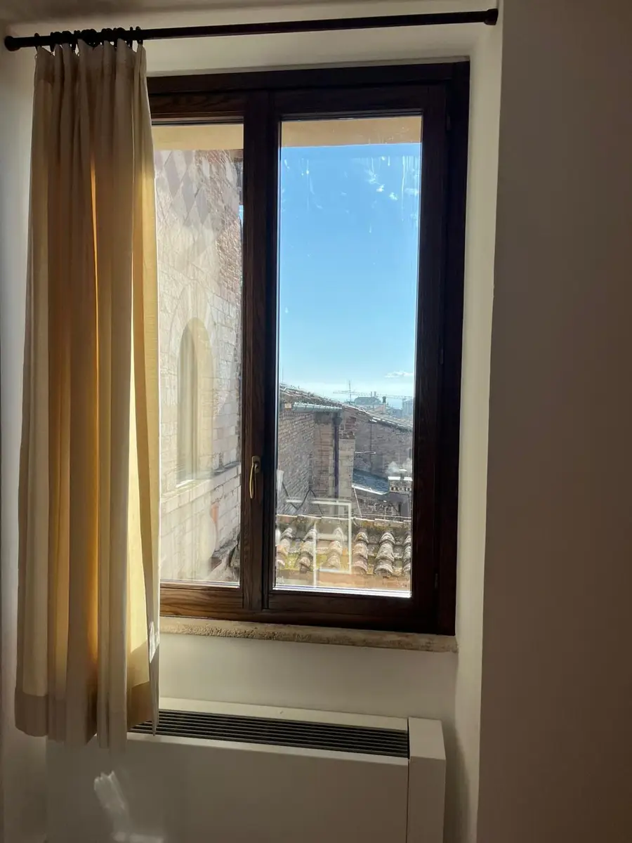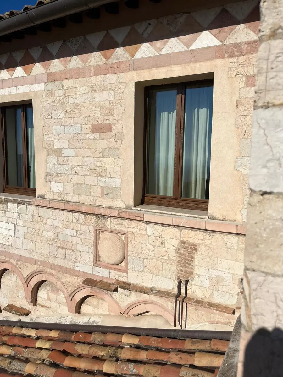 La scelta della finitura degli infissi in legno – Rovere Testa di Moro – assicura un impeccabile equilibrio cromatico e materico, in pieno dialogo con le superfici lapidee e le cromie tipiche dell’architettura medievale umbra senza rinunciare a un’elevata fedeltà estetica al contesto originario.